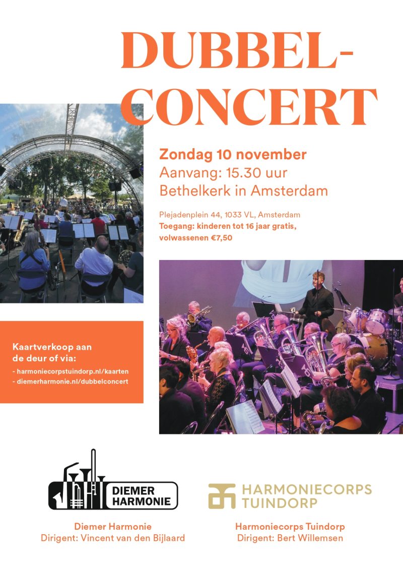 Op zondag 10 november zal de Diemer Harmonie een dubbelconcert geven met de Harmonicorps Tuindorp in de Bethelkerk in Amsterdam Noord. Het concert begint om 15:30 uur en zal onder leiding staan van dirigenten Vincent van den Bijlaard en Bert Willemsen.
