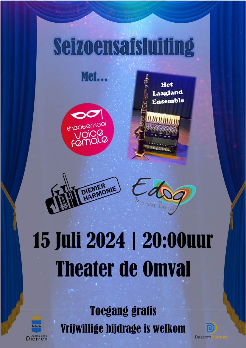 Naast de Diemer Harmonie treden ook EDOG, Voice FeMale en Jan Rijnierse van het Laagland Ensemble op in de theater zaal.